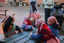 MYRTHUE i Ribe har pakket dragkisten. I dragter og med flettet og vandkæmmet hår, som tiden bød, følger eleverne i Jacobs fodspor rundt i Ribe på de autentiske steder, hvor Jacob bl.a. har leget, boet og gået i skole da han var barn.